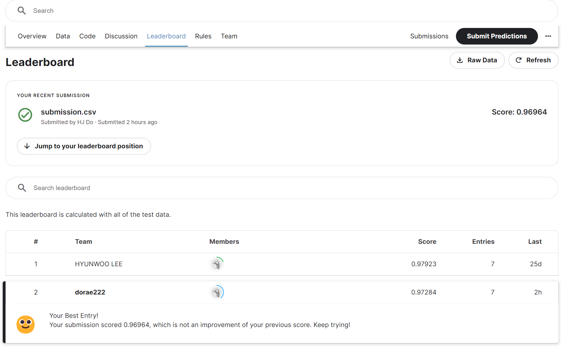 현재 기준으로 97.2%정도의 정확도로 2등에 위치해 있습니다.